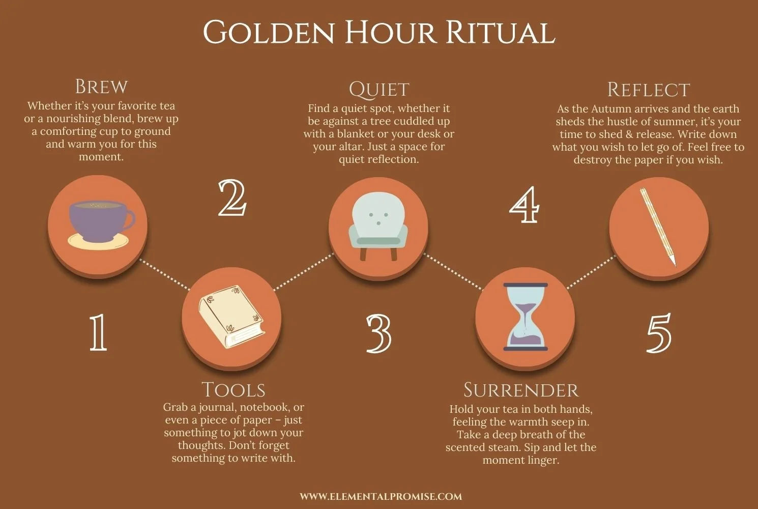 Step 1: Brew up something hot. Lemon water, your favorite Elemental Promise tea, coffee, a hot toddy, anything. Your goal is to let the warmth seep into you and the fragrance of whatever you brew soothe your mind and heart. Bonus points if you manage to get something with a grounding herb or two inside. Using a few of the herbs described above can help draw you into the earthy vibes of autumn and anchor you down as the light and warmth of summer fade away.